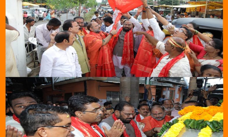चंद्रपूर – ( इंडिया 24 न्युज ) : श्री माता महाकाली महोत्सवानिमित्त महाकाली मंदिरासमोर 51 फूट उंच असलेल्या महाकाली महोत्सवाच्या ध्वजाचे आमदार किशोर जोरगेवार यांच्या हस्ते ध्वजारोहण करण्यात आले. त्यानंतर मातेची चांदीची मुर्ती मिरवणूक काडत श्री माता महाकाली महोत्सवाचे विश्वस्त राजु शास्त्रकार यांच्या निवास्थानी नेण्यात आली. यावेळी आमदार किर्तिकुमार भांगडिया यांची विशेष उपस्थिती होती. तसेच या प्रसंगी श्री माता महाकाली ट्रस्टच्या पदाधिकार्यांची मोठ्या संख्येने उपस्थिती होती.