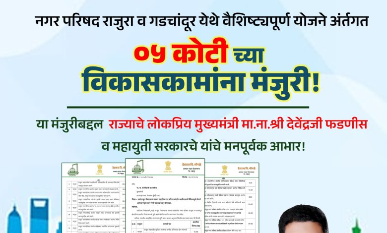 या निधीसाठी आमदार देवराव भोंगळे यांनी राज्याचे लोकप्रिय मुख्यमंत्री मा. देवेंद्रजी फडणवीस यांच्याकडे सातत्याने पाठपुरावा केला होता, ज्याला आता यश मिळाले आहे. या महत्त्वपूर्ण मंजुरीमुळे राजुरा आणि गडचांदूर शहराच्या विकासात मोठी भर पडणार असून अनेक लोकावश्यक कामे मार्गी लागणार आहेत.