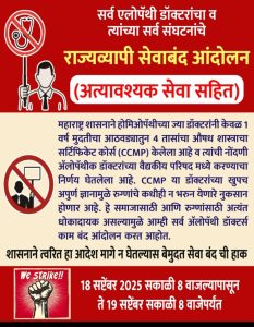 आमची मागणी : CCMP डॉक्टरांना MMC मध्ये नोंदणी देण्याचा निर्णय तात्काळ स्थगित करावा. नागरिकांच्या सुरक्षिततेसाठी केवळ MBBS डॉक्टरांनाच आधुनिक वैद्यकीय परवाना द्यावा. संबंधित 05/09/2025 चे परिपत्रक त्वरित मागे घेण्यात यावे. आंदोलनाचा निर्णय : दिनांक 18 सप्टेंबर 2025 रोजी संपूर्ण राज्यभर 24 तासांचा लाक्षणिक संप करण्यात येणार असून सर्व आरोग्यसेवा बंद ठेवण्यात येतील.