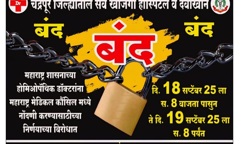 ▪️चंद्रपूर जिल्ह्यातील सर्व खाजगी हॉस्पिटल व दवाखाने गुरुवारी 18 सप्टेंबर 25 रोजी बंद..